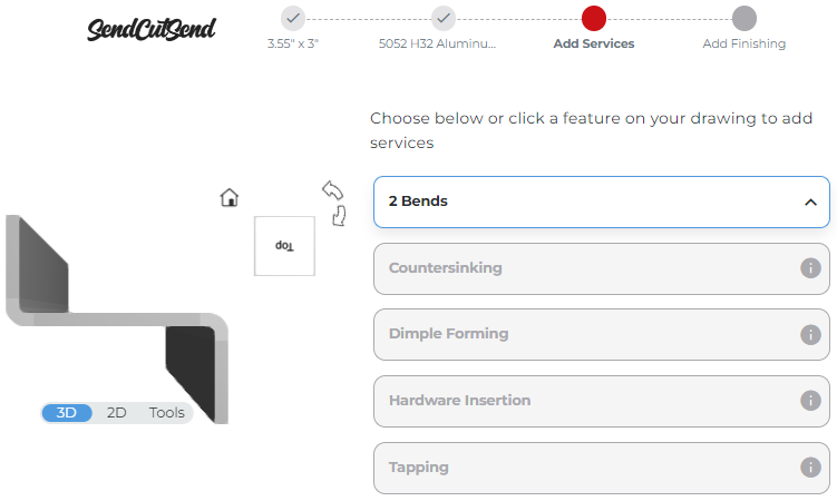 If you added bend lines, they should show as blue dashed lines. After selecting a material thickness that we bend, you’ll be able to configure the bend angle and direction for each bend line at the Add Services step in our pricing system.